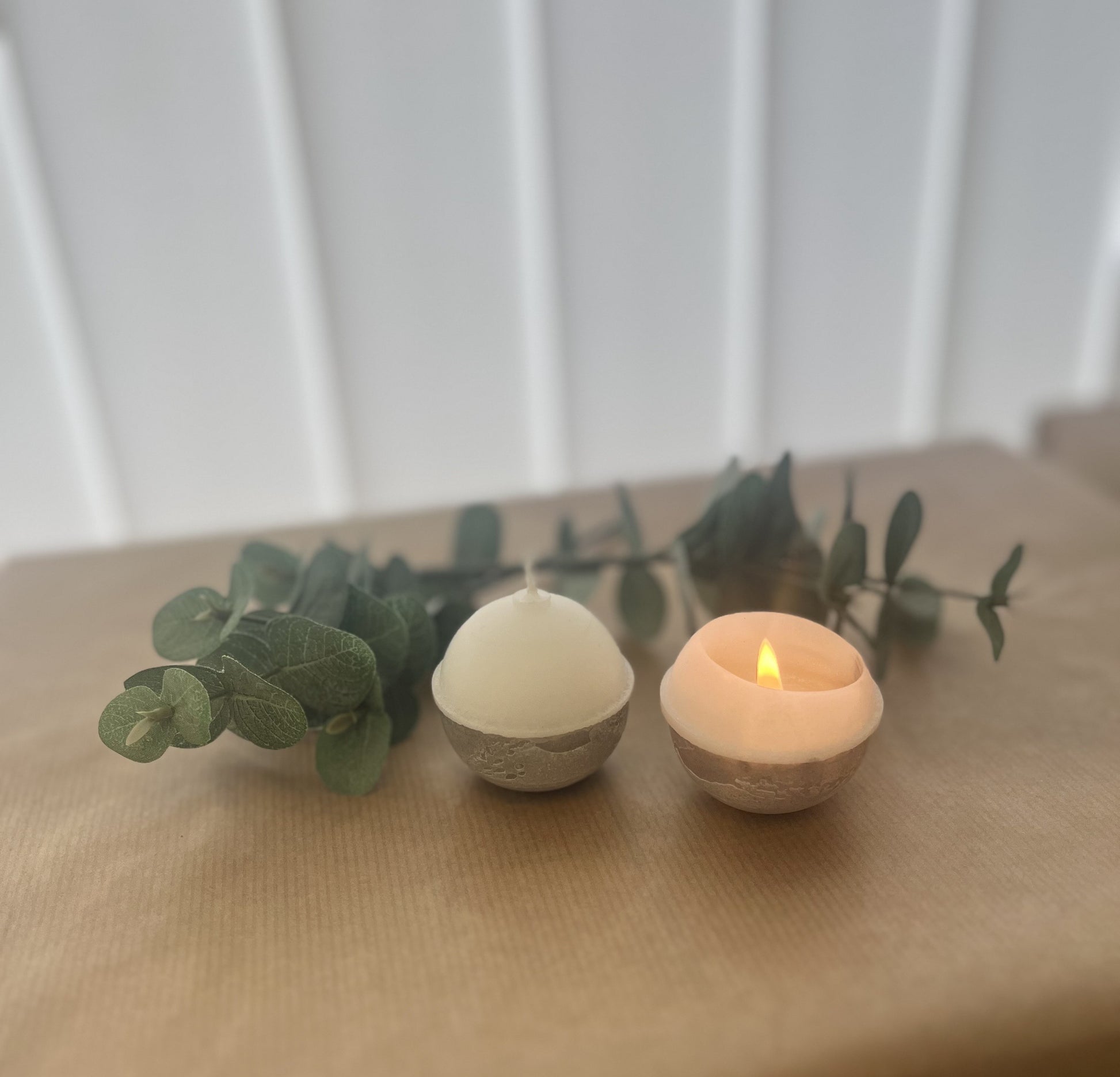 Klotljuset Lillan kan man ställa direkt på bordet. Foten är gjord av Jesmonite. 5 cm i diameter.